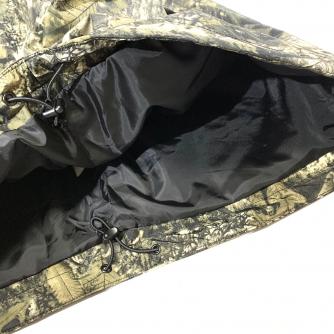 防水生地使用、フード、裾ドローコード搭載、袖にベルクロフラップ付き。